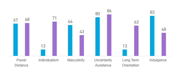 Colombia and France in terms of power distance are very similar because are some people that are rich and some that are poor, and not all the people have the same money and the gap between rich and poor people are very high. France are more individualist than Colombia because more people has more focus on their future plans and are more independent and a earlier age, In contrast, Colombia are more colectivist because in our society, the opinion of the people take more importance and the idea to only be focus on your plan are less because the people want to work with other people and to share their goals with others to. France are more a feminity society than masculinity because the people are more interest in cooperated with other in some situation, in contrast, Colombia are more a masculinity society because the people compete with others to get a specific thing specifically in the work, to get a high charge.